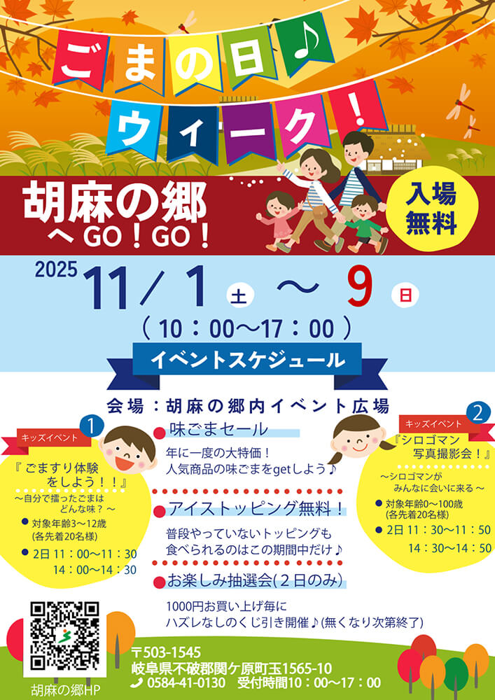胡麻の郷では、11月1日(金)~11月9日(土)の9日間にわたり、毎年恒例の「ごまの日ウィーク」を開催いたします!