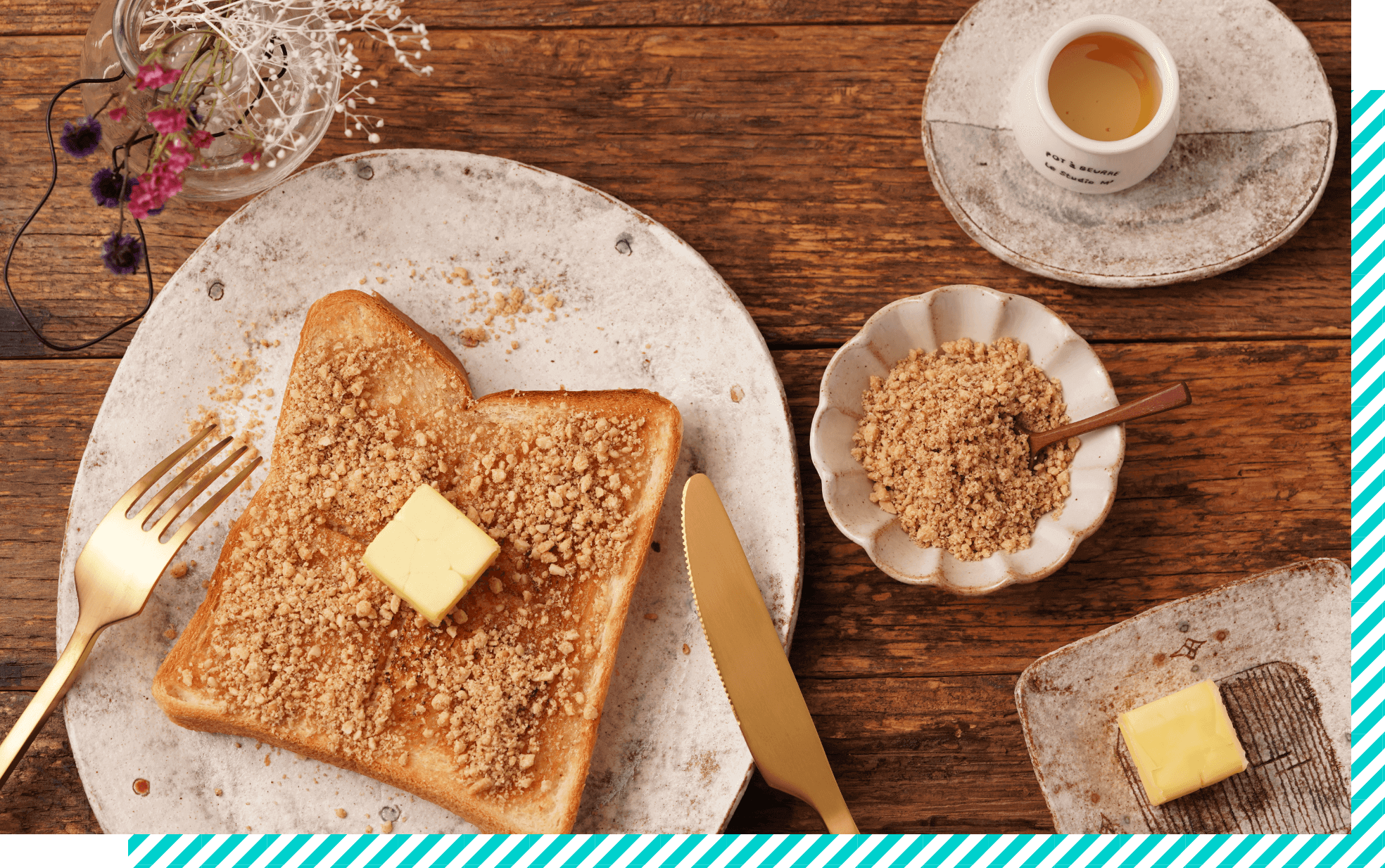 ①にはちみつを塗り、クラッシュアーモンドすりごまをかけ、バターをのせる。