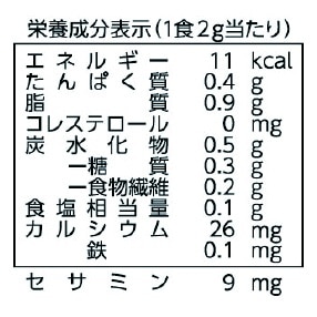 いりごま(国内製造)、醤油(小麦・大豆を含む)、砂糖、米粉、粉末醤油(小麦・大豆を含む)、焦がし醤油ペースト(小麦・大豆を含む)/調味料(アミノ酸等)、貝カルシウム、加工でん粉、甘味料(カンゾウ)